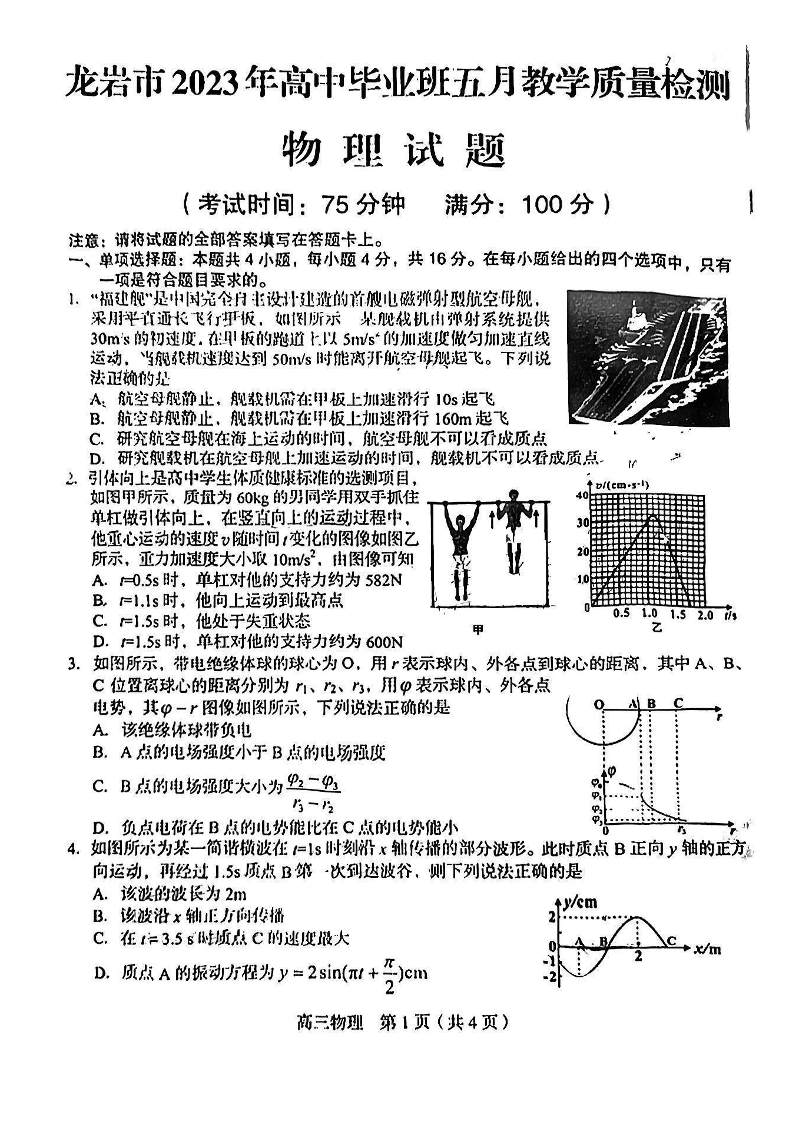 龙岩市2023年高中毕业班五月教学质量检测 物理