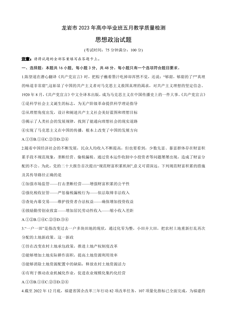 龙岩市2023年高中毕业班五月教学质量检测 政治