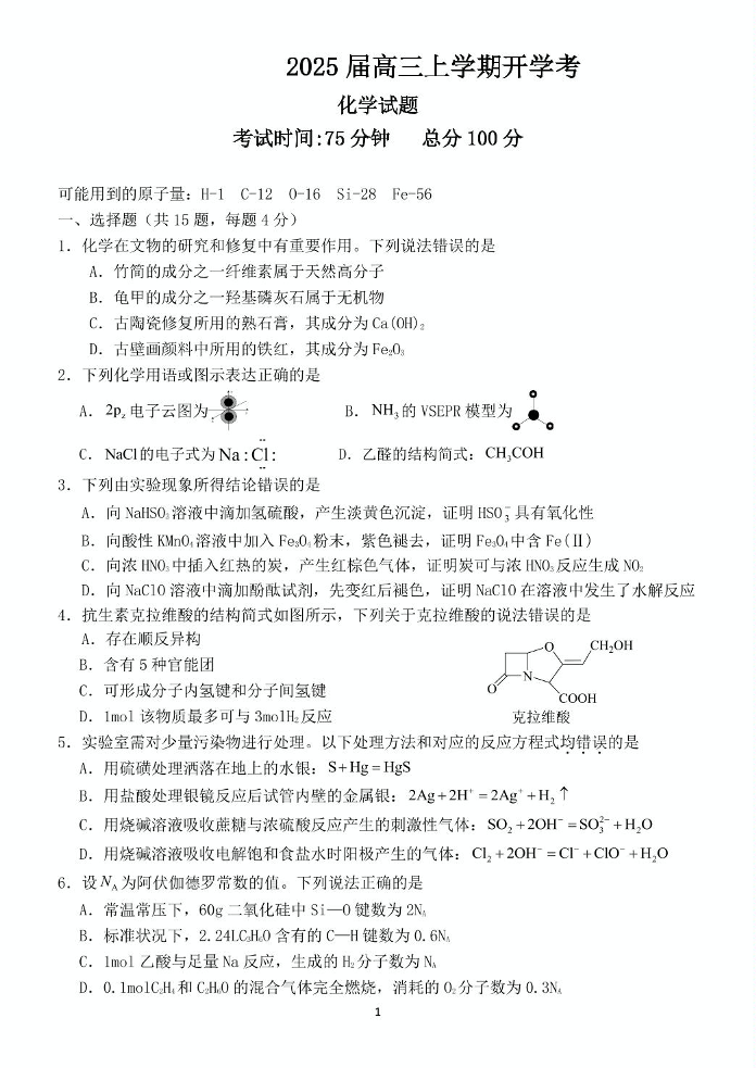 福建省龙岩市龙岩一中2025届高三上学期开学考试+化学