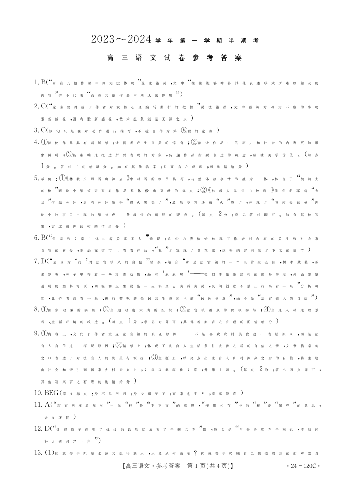 福建省龙岩市名校2023-2024学年高三上学期期中考试 语文答案