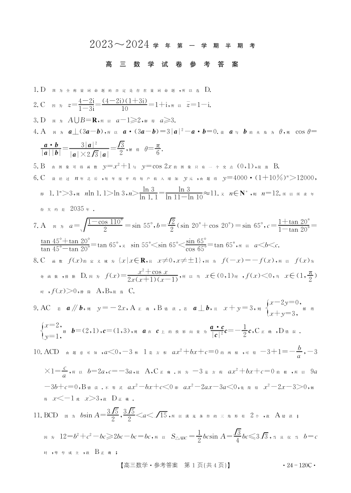 福建省龙岩市名校2023-2024学年高三上学期期中考试 数学答案