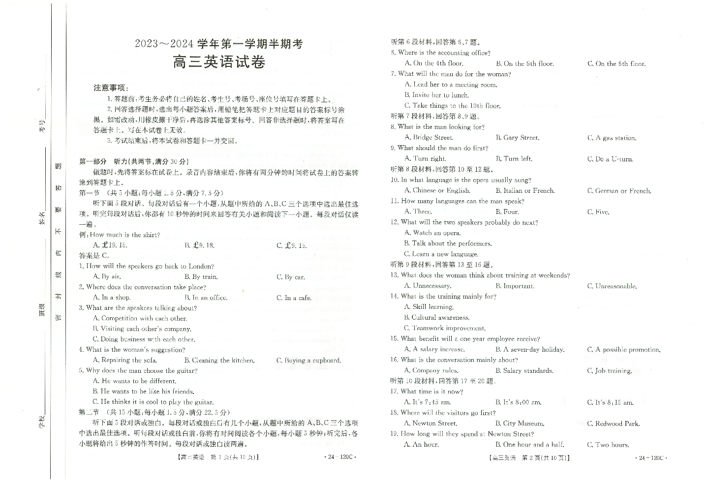 福建省龙岩市名校2023-2024学年高三上学期期中考试 英语