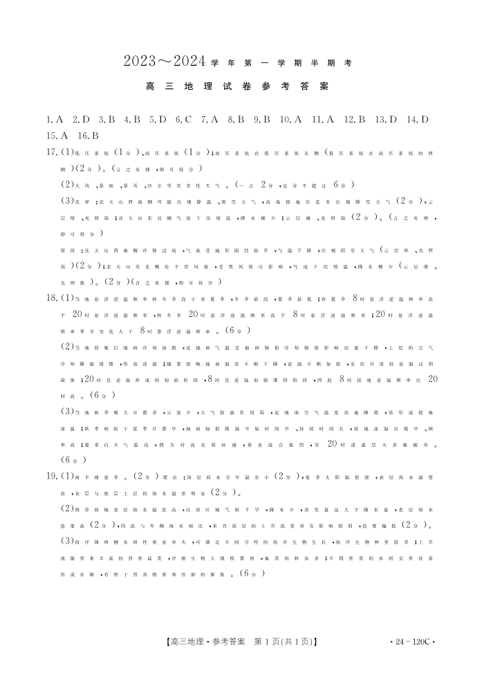福建省龙岩市名校2023-2024学年高三上学期期中考试 地理答案