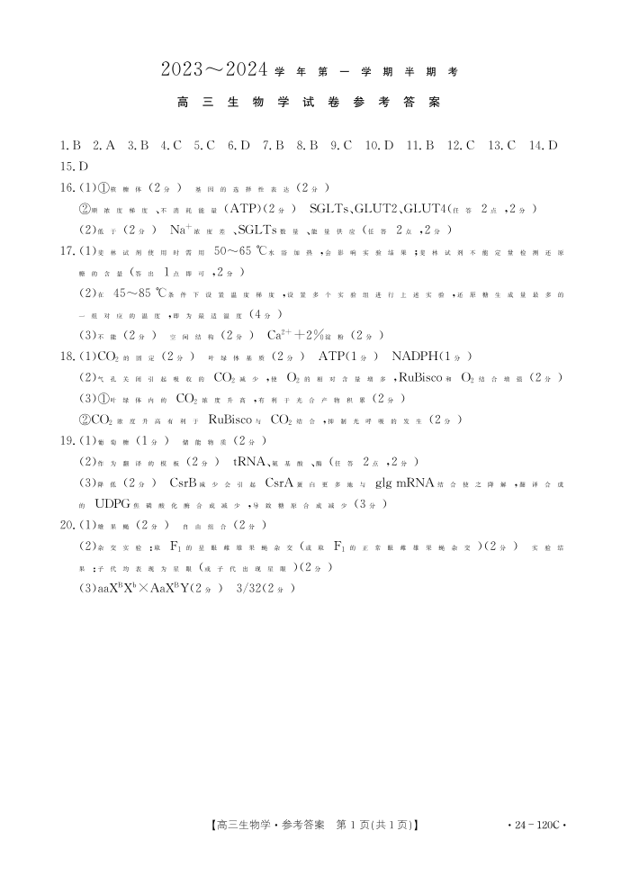 福建省龙岩市名校2023-2024学年高三上学期期中考试 生物答案
