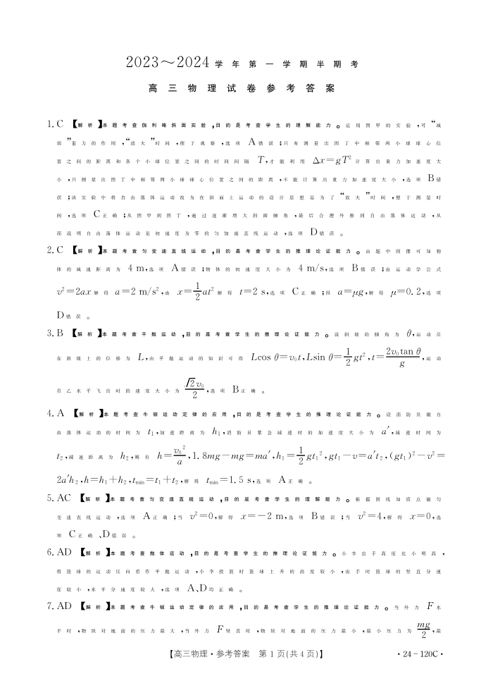 福建省龙岩市名校2023-2024学年高三上学期期中考试 物理答案