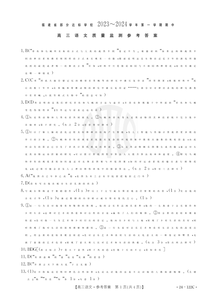 福建省宁德市部分达标学校2023-2024学年高三上学期期中质量检测 语文答案