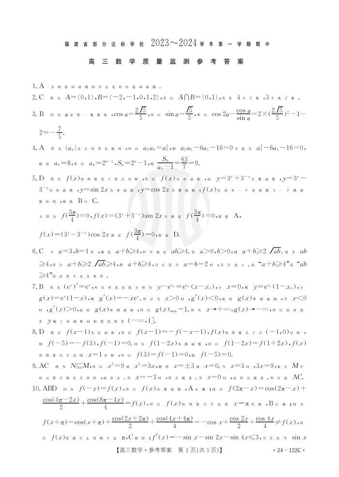 福建省宁德市部分达标学校2023-2024学年高三上学期期中质量检测 数学答案