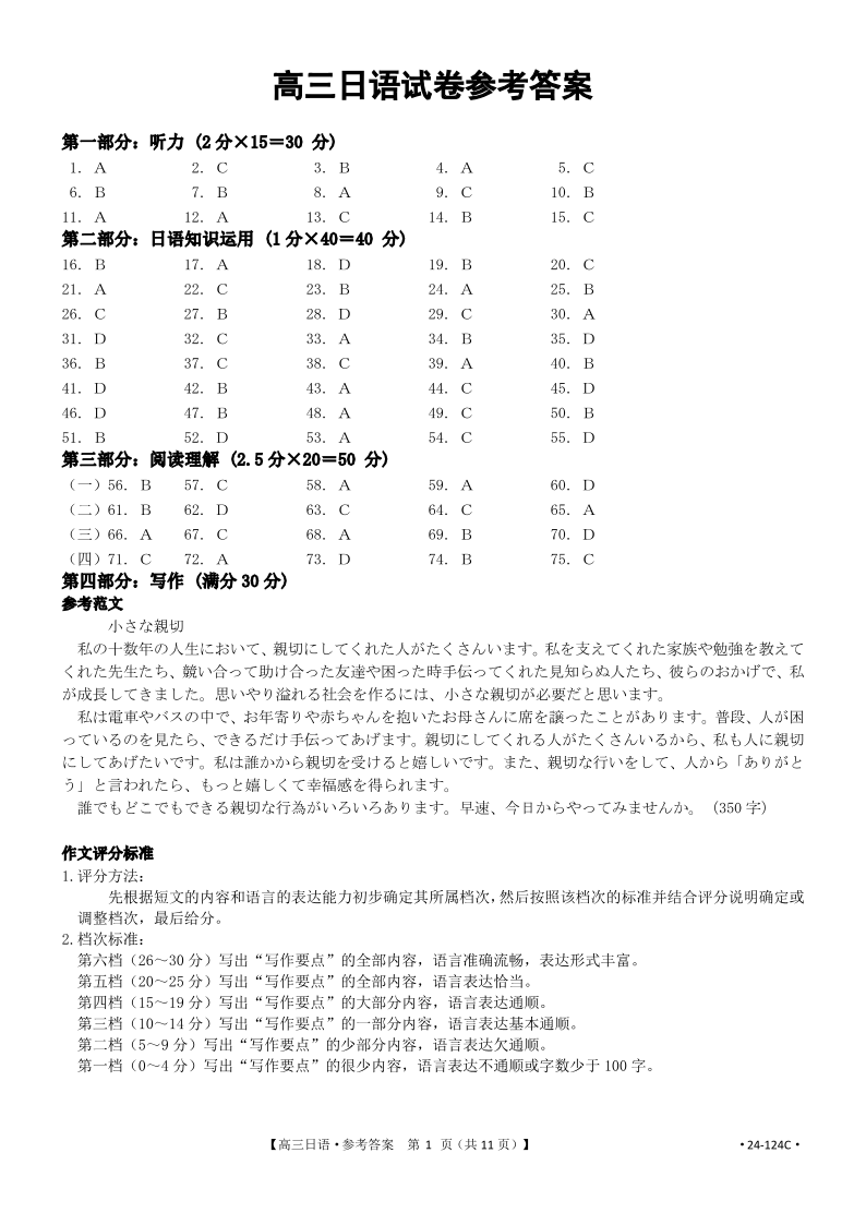 福建省宁德市部分达标学校2023-2024学年高三上学期期中质量检测 日语答案