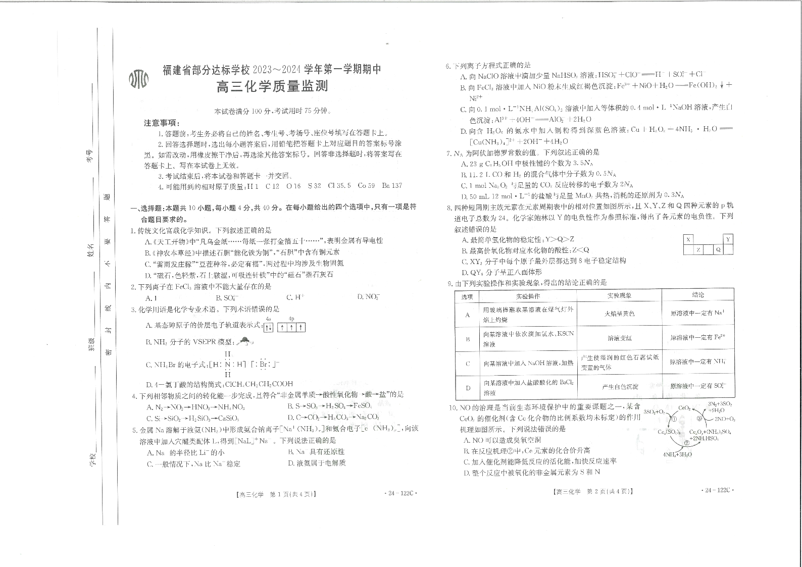 福建省宁德市部分达标学校2023-2024学年高三上学期期中质量检测 化学