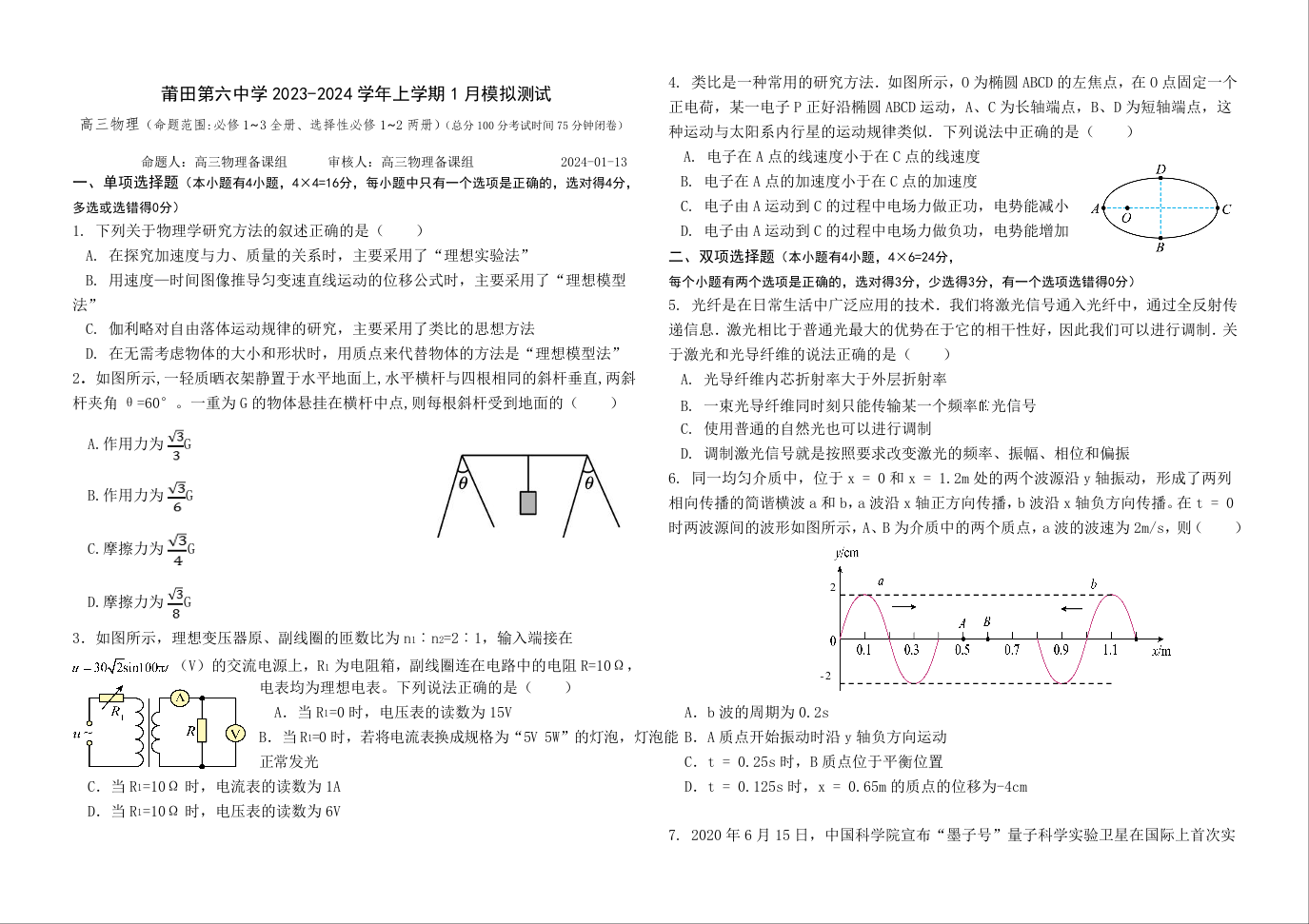 福建省莆田第六中学2023-2024学年高三上学期1月质检模拟测试+物理+Word版含答案