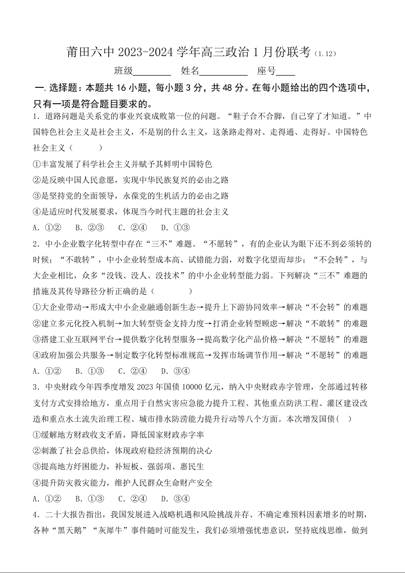 福建省莆田第六中学2023-2024学年高三上学期1月质检模拟测试+政治+Word版含解析