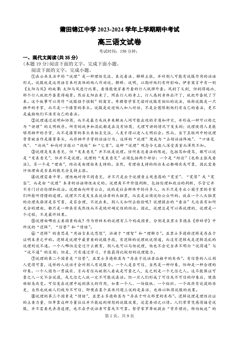 福建省莆田锦江中学2023-2024学年高三上学期期中考试 语文