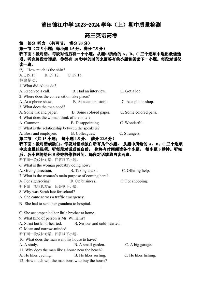 福建省莆田锦江中学2023-2024学年高三上学期期中考试 英语