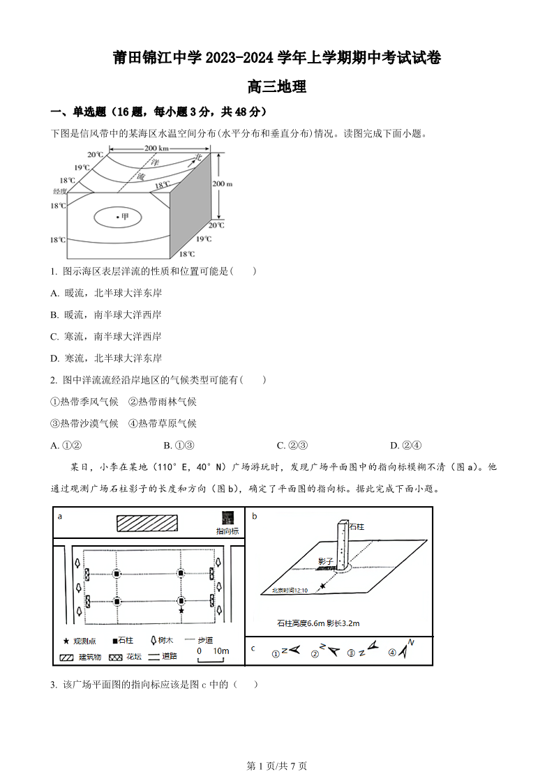 福建省莆田锦江中学2023-2024学年高三上学期期中考试 地理