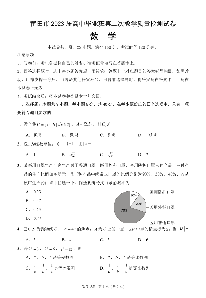 2023届福建莆田市高三毕业班第二次教学质量检测丨数学