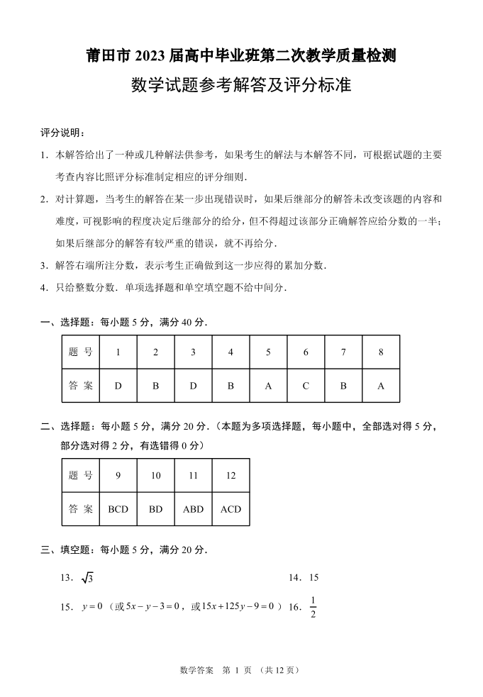2023届福建莆田市高三毕业班第二次教学质量检测丨数学答案