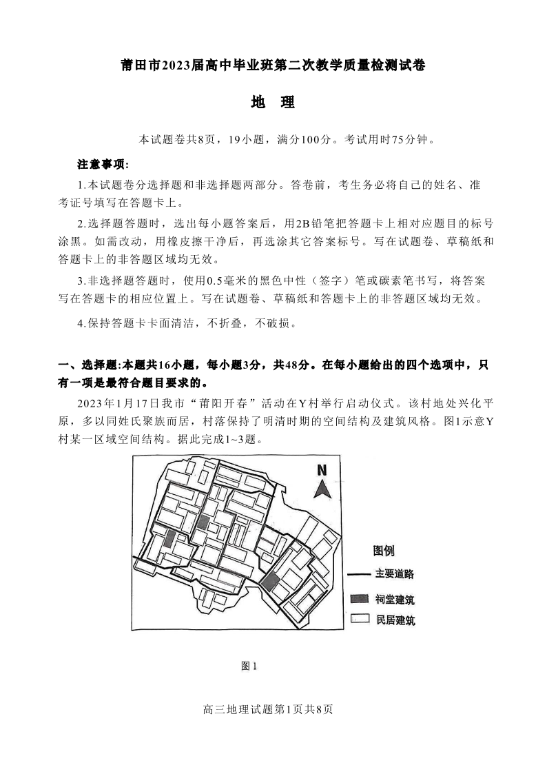 2023届福建莆田市高三毕业班第二次教学质量检测丨地理