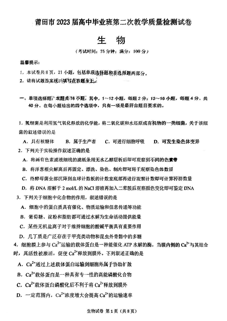2023届福建莆田市高三毕业班第二次教学质量检测丨生物