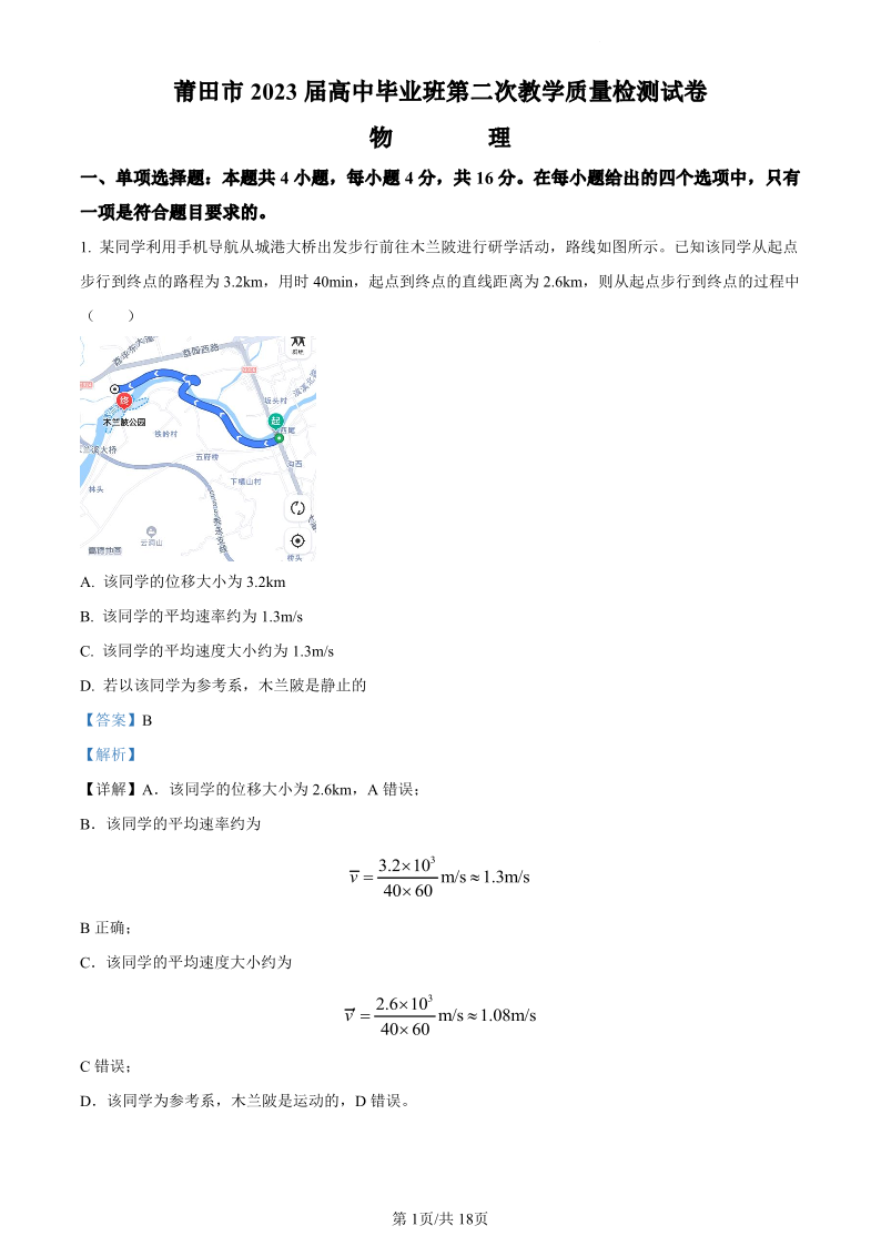 2023届福建莆田市高三毕业班第二次教学质量检测丨物理答案