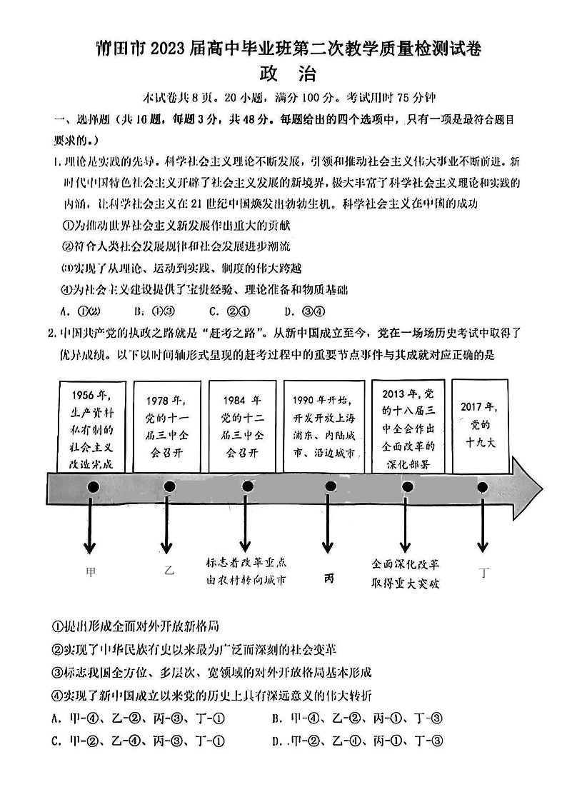 2023届福建莆田市高三毕业班第二次教学质量检测丨政治