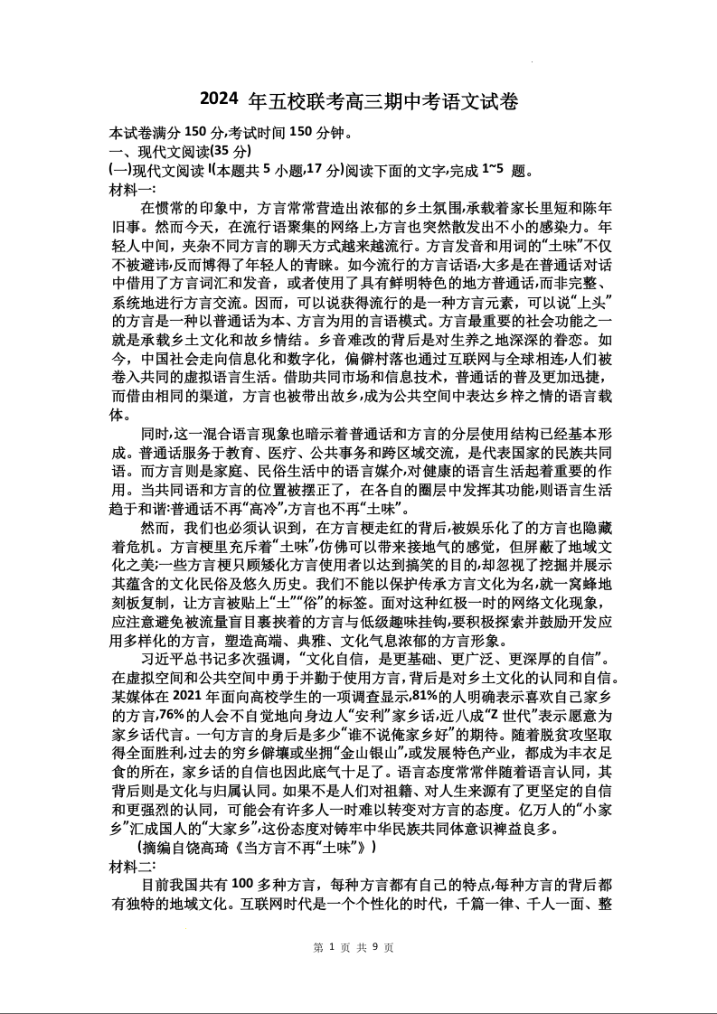 福建省莆田市五校联盟2023-2024学年高三上学期期中考试 语文