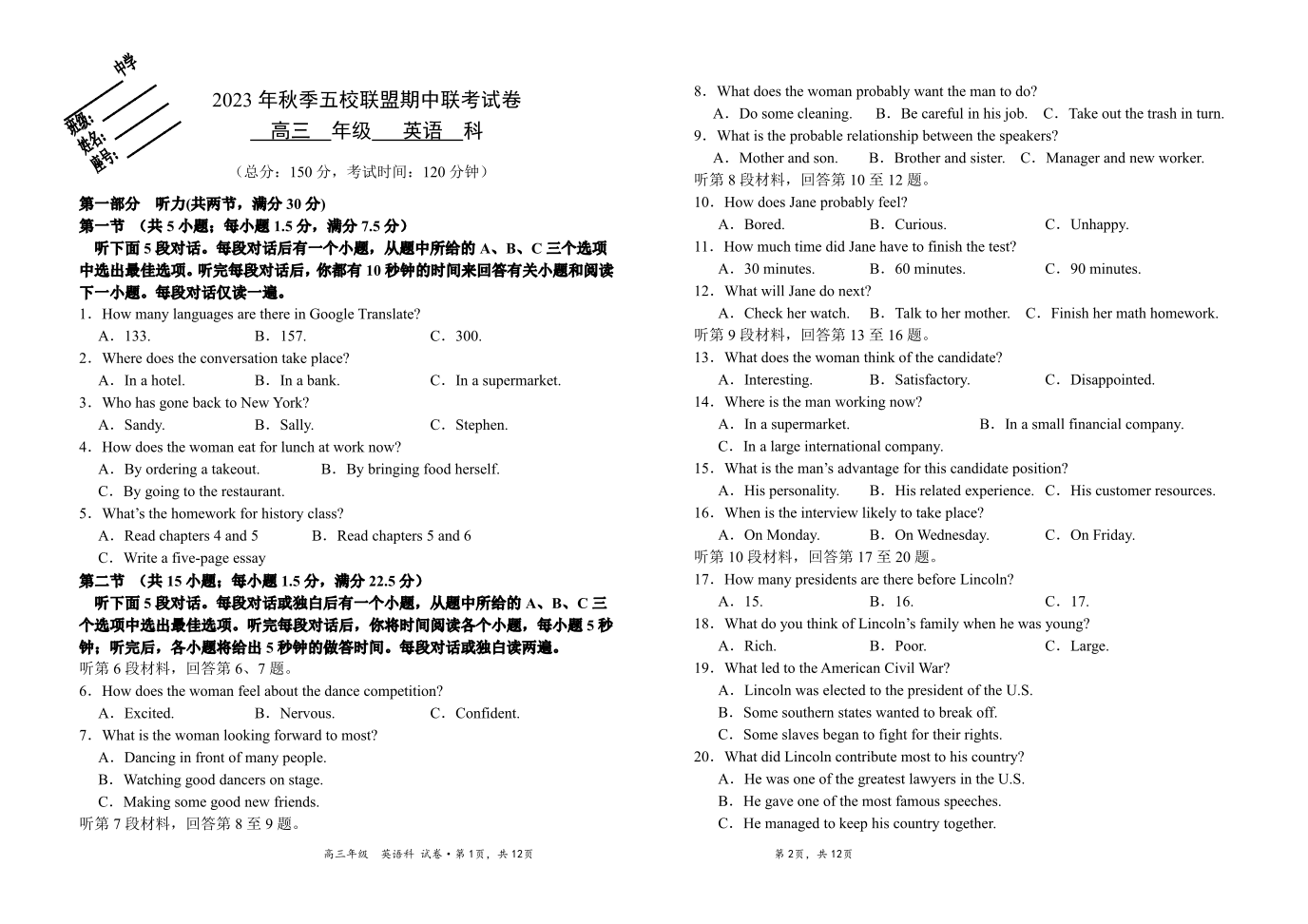 福建省莆田市五校联盟2023-2024学年高三上学期期中考试 英语