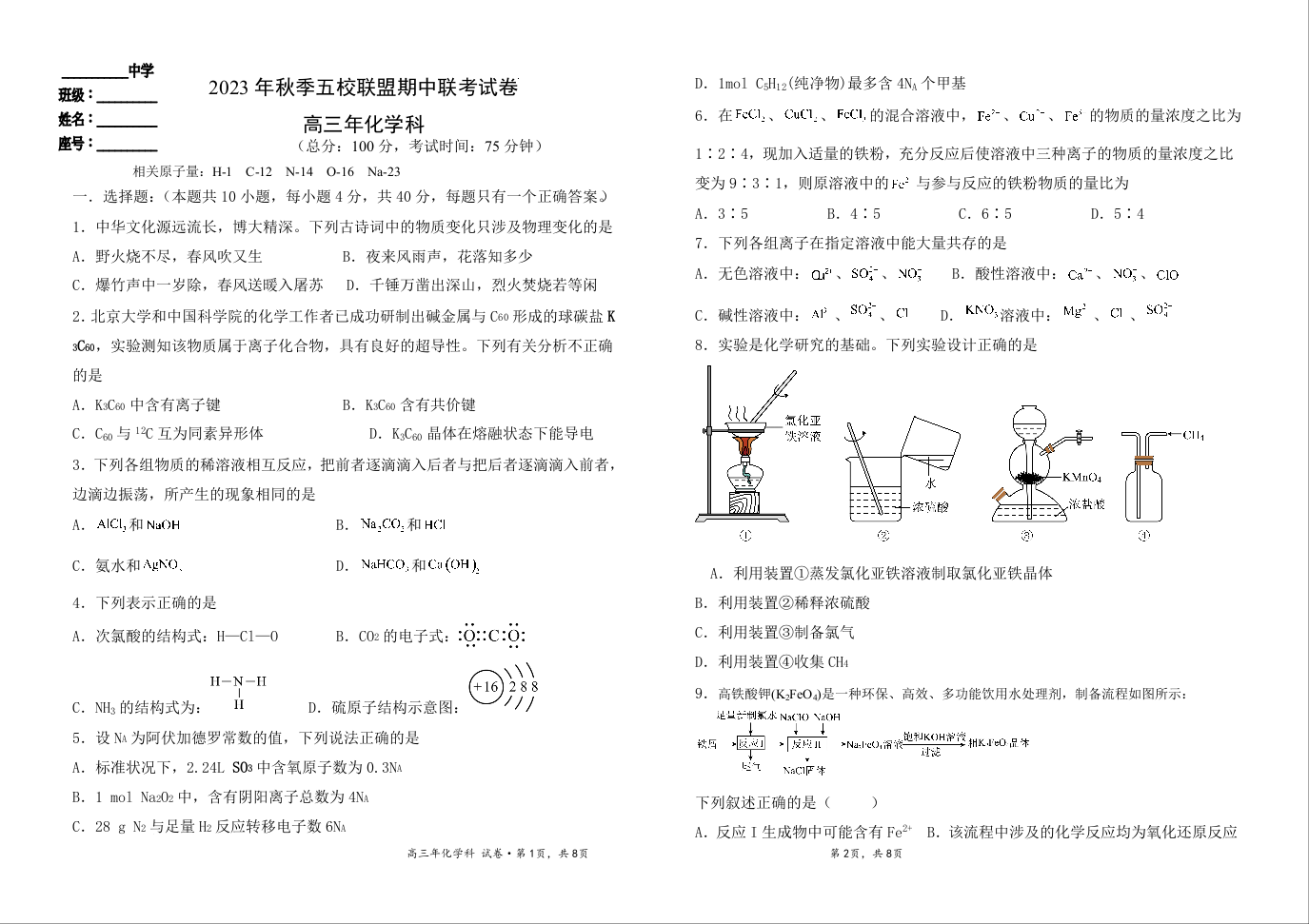 福建省莆田市五校联盟2023-2024学年高三上学期期中考试 化学