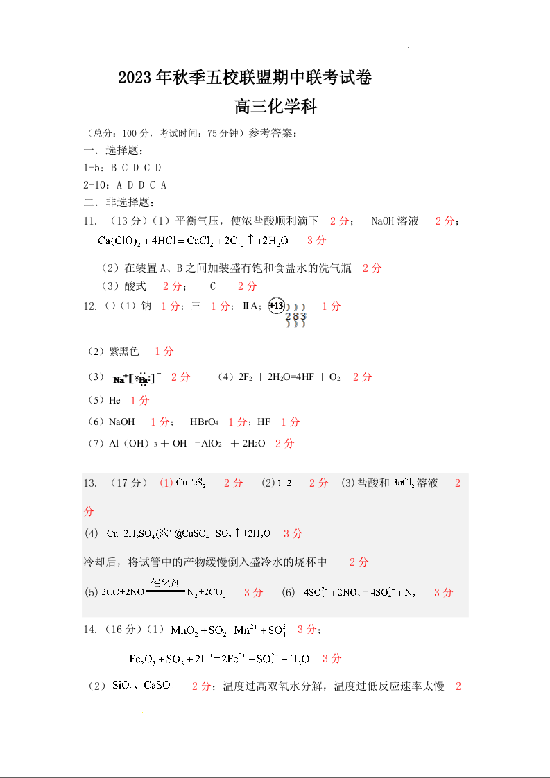 福建省莆田市五校联盟2023-2024学年高三上学期期中考试 化学答案