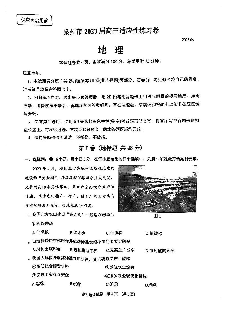泉州市2023届高三适应性练习卷 地理