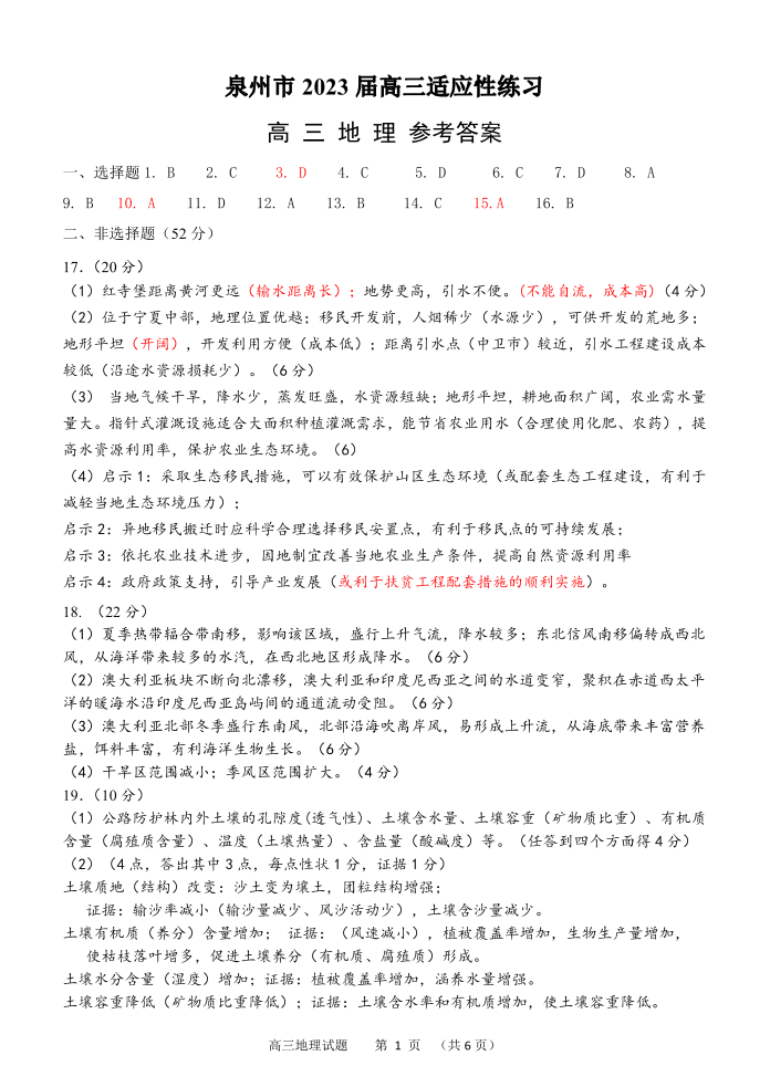 泉州市2023届高三适应性练习卷 地理答案