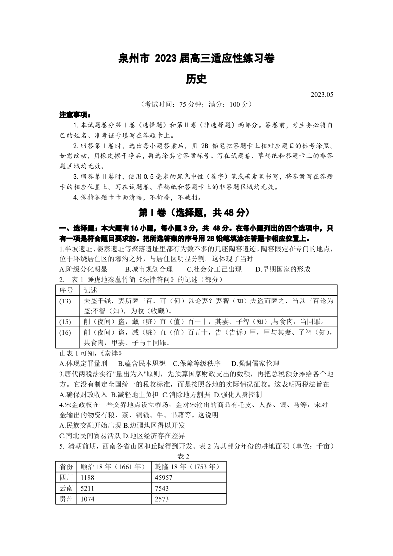 泉州市2023届高三适应性练习卷 历史
