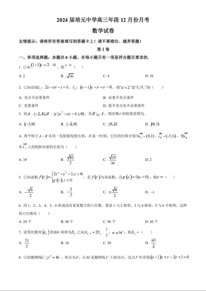 福建省泉州市培元中学2023-2024学年高三上学期12月月考试题 数学