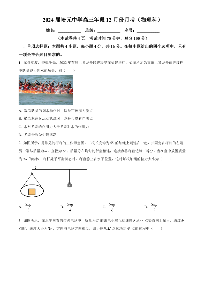 福建省泉州市培元中学2023-2024学年高三上学期12月月考试题 物理