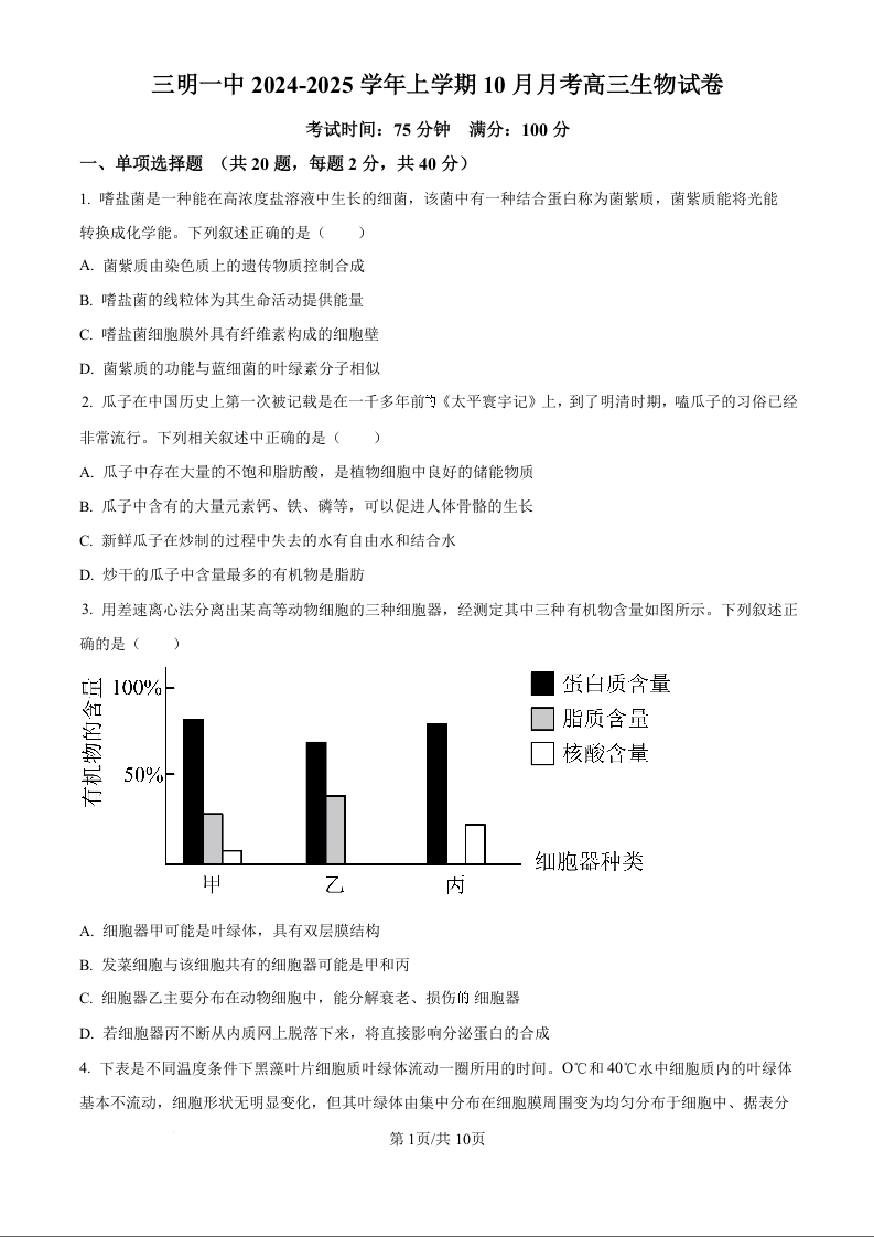 福建省三明第一中学2025届高三上学期10月月考+生物