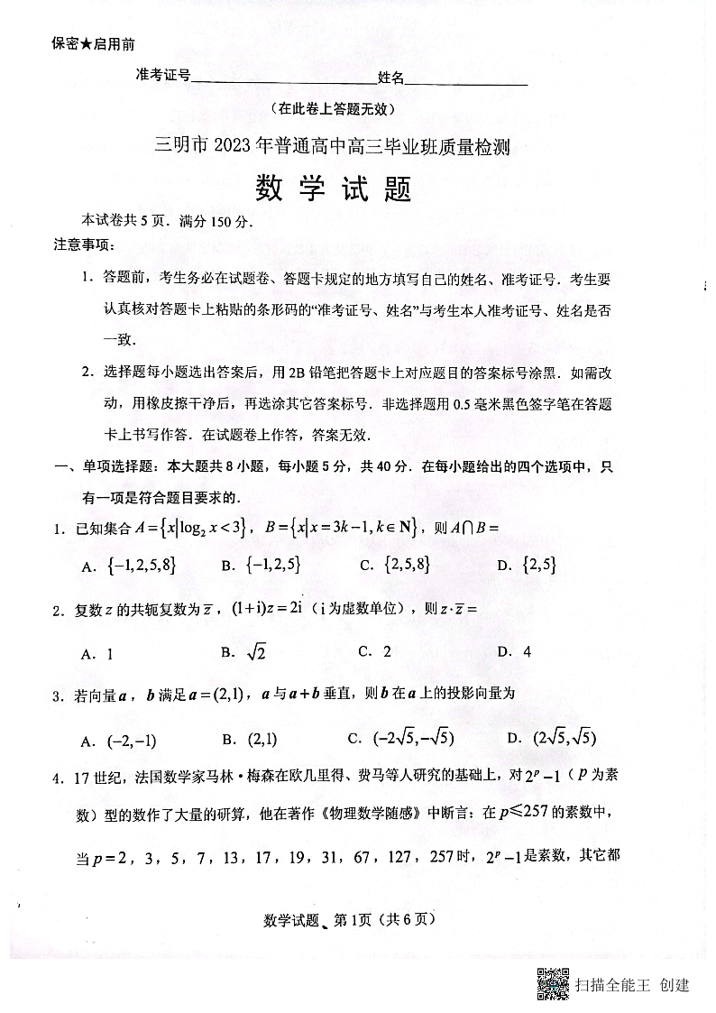 数学试题-2023三明三检试卷及答案