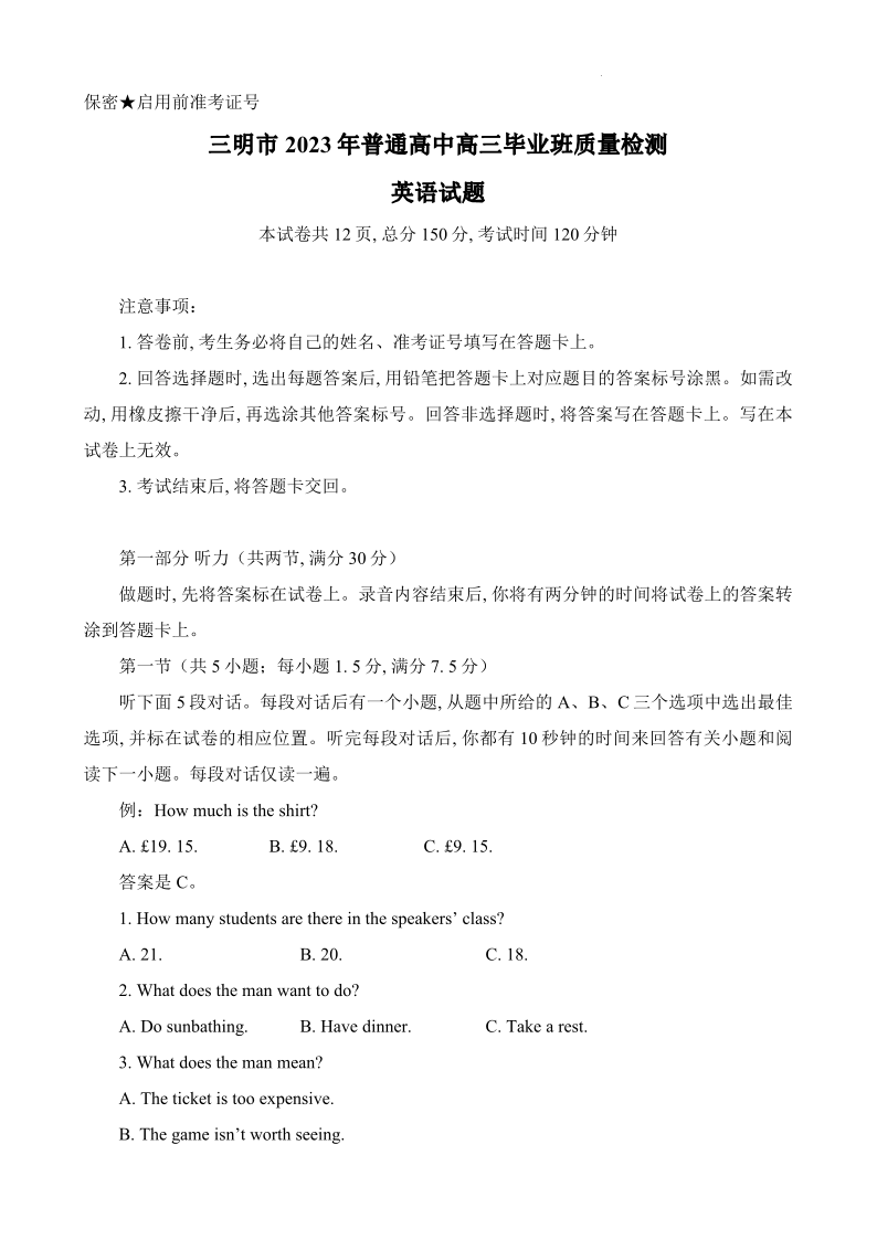 英语试题-2023三明三检试卷及答案