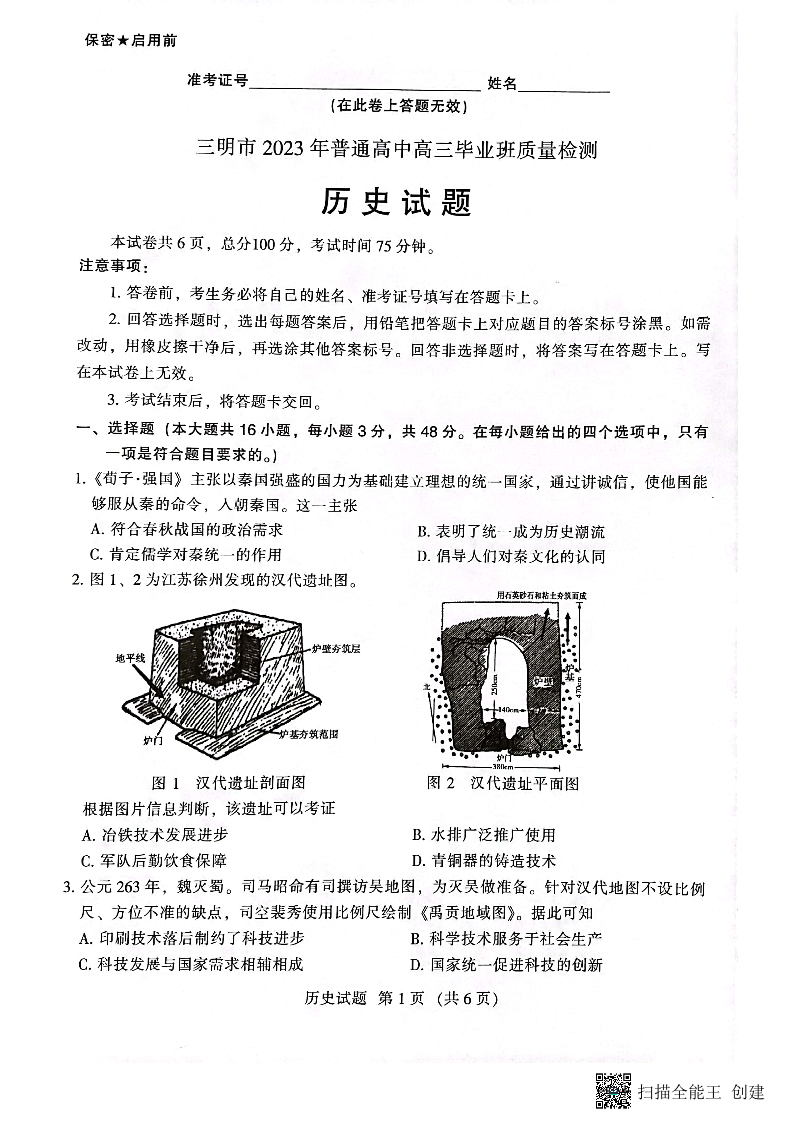 历史试题-2023三明三检试卷及答案