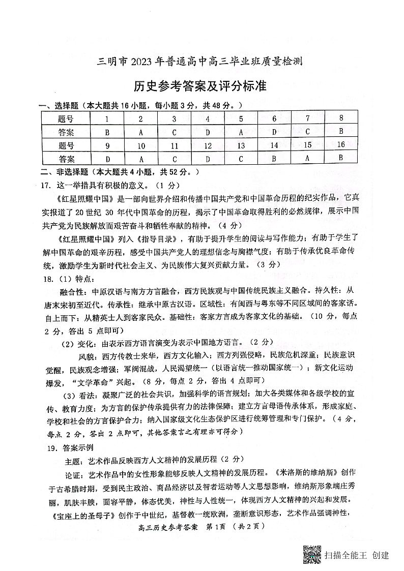 历史答案-2023三明三检试卷及答案