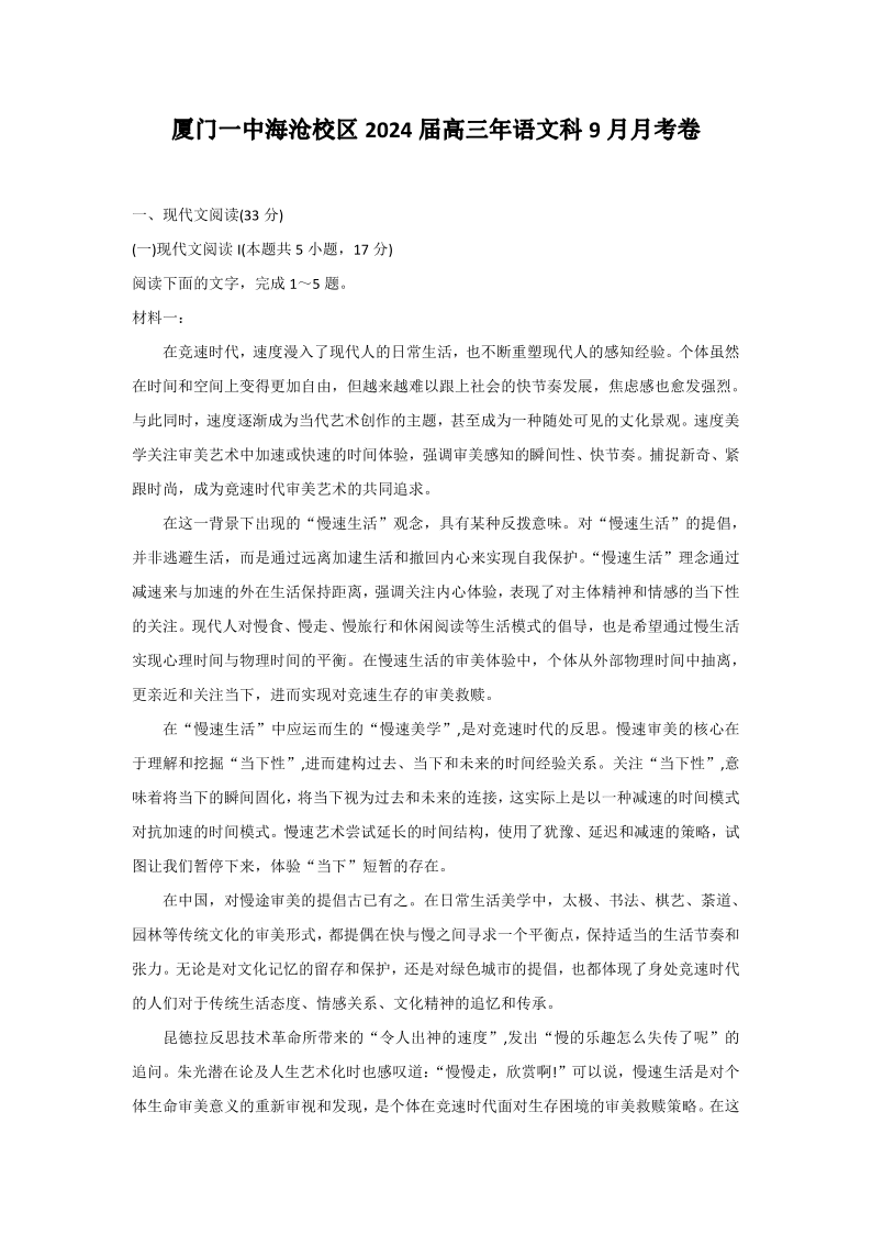 福建省厦门第一中学海沧校区2023-2024学年高三上学期9月月考 语文