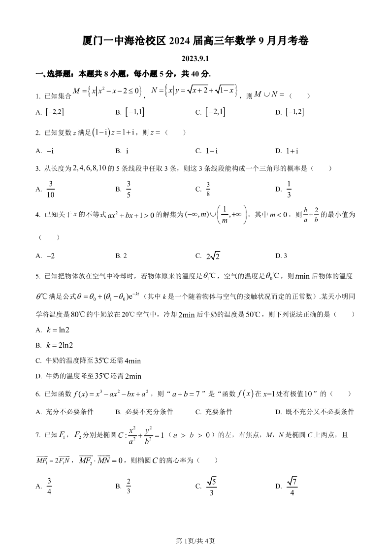 福建省厦门第一中学海沧校区2023-2024学年高三上学期9月月考 数学