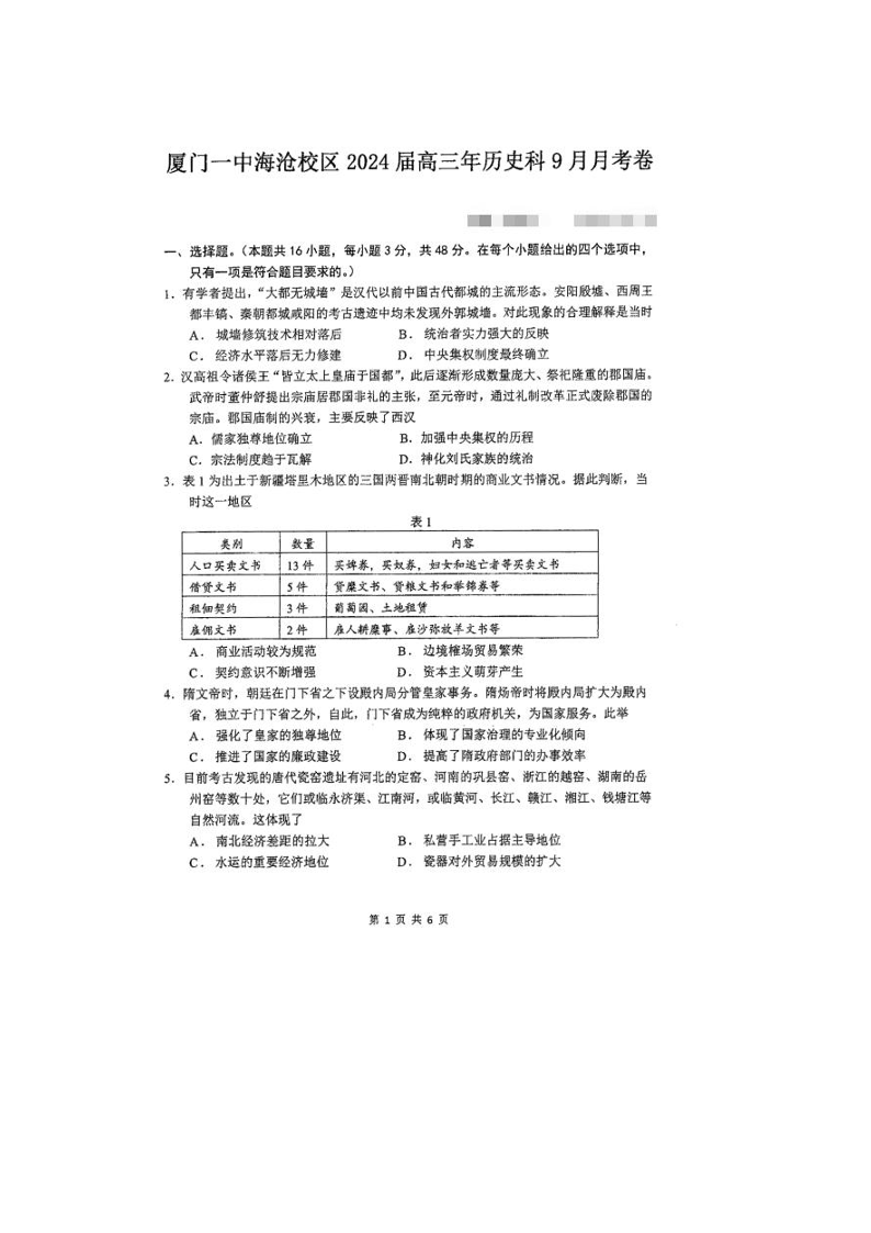 福建省厦门第一中学海沧校区2023-2024学年高三上学期9月月考 历史