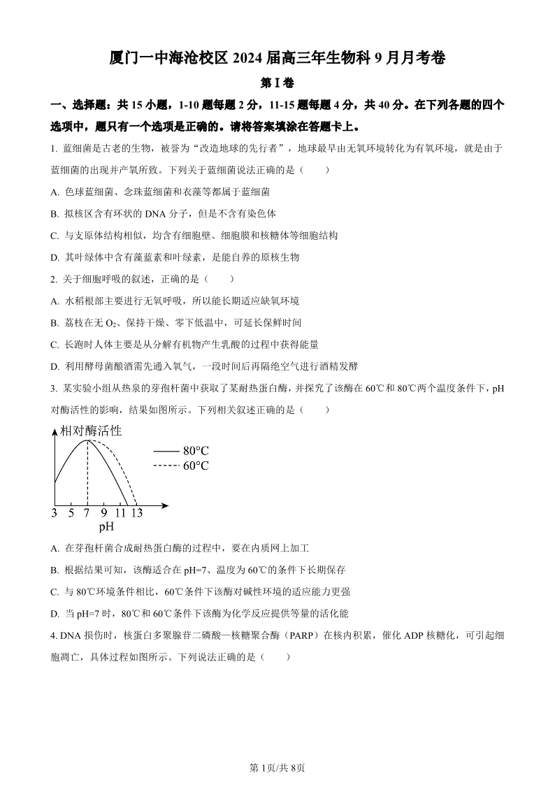 福建省厦门第一中学海沧校区2023-2024学年高三上学期9月月考 生物