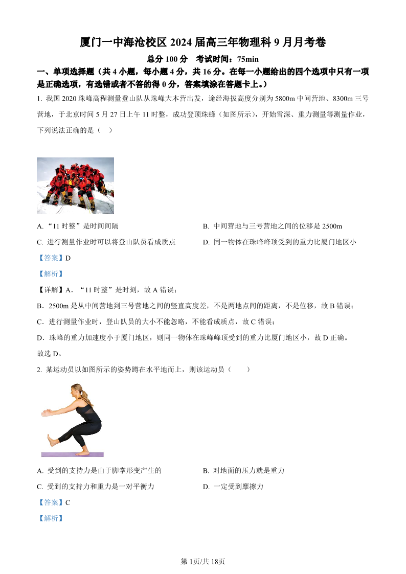 福建省厦门第一中学海沧校区2023-2024学年高三上学期9月月考 物理答案