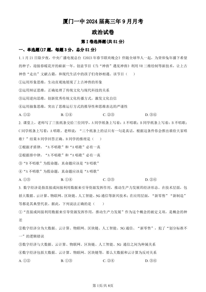 福建省厦门第一中学海沧校区2023-2024学年高三上学期9月月考 政治