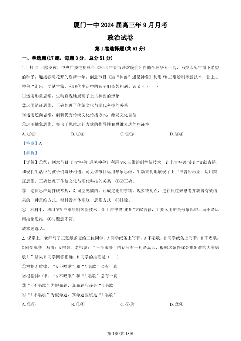 福建省厦门第一中学海沧校区2023-2024学年高三上学期9月月考 政治答案