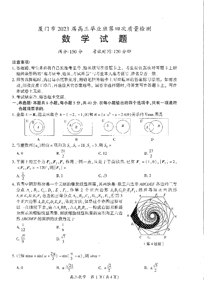 福建省厦门市2023届高三毕业班第四次质量检测 数学