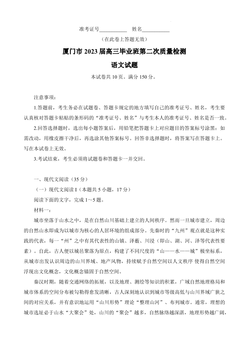 2023届福建省厦门市高三毕业班第二次质量检测丨语文