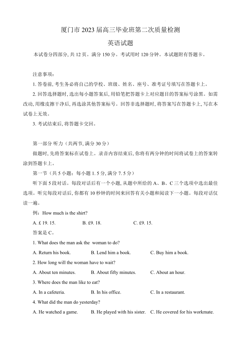 2023届福建省厦门市高三毕业班第二次质量检测丨英语