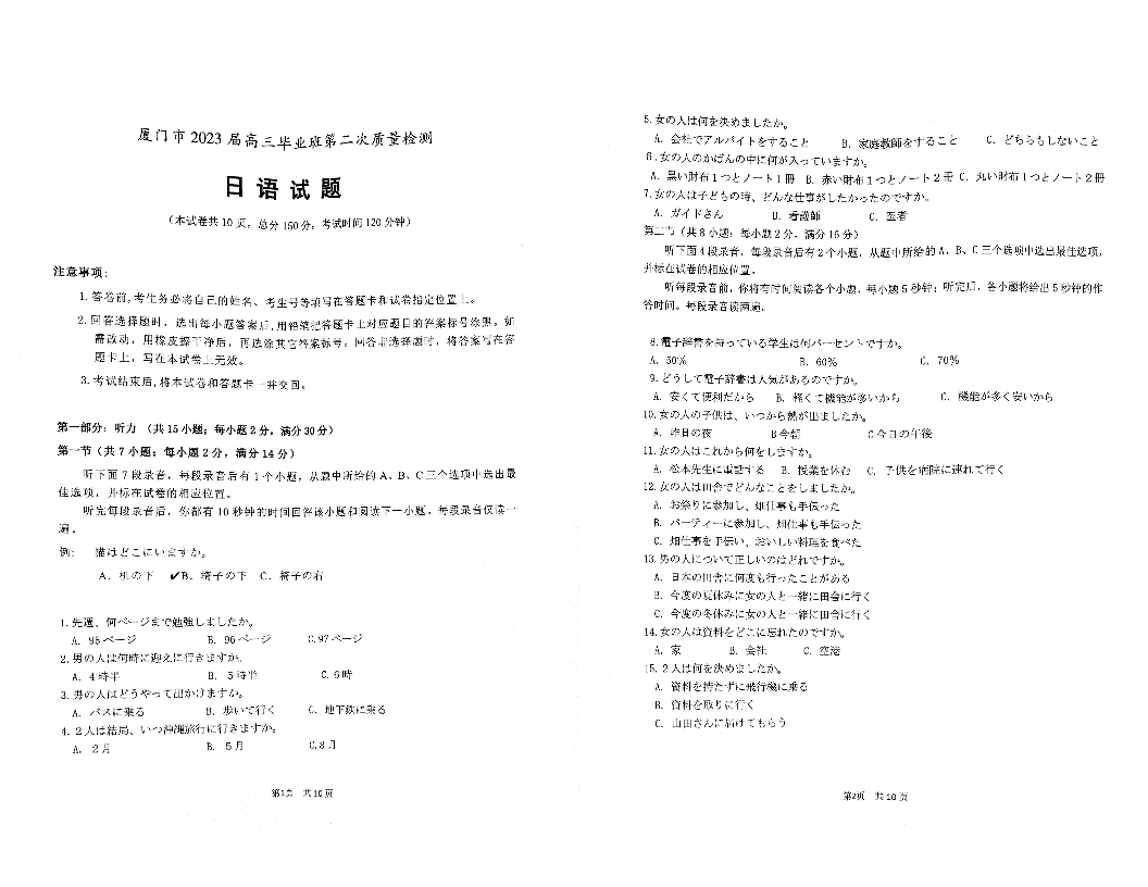 2023届福建省厦门市高三毕业班第二次质量检测丨日语