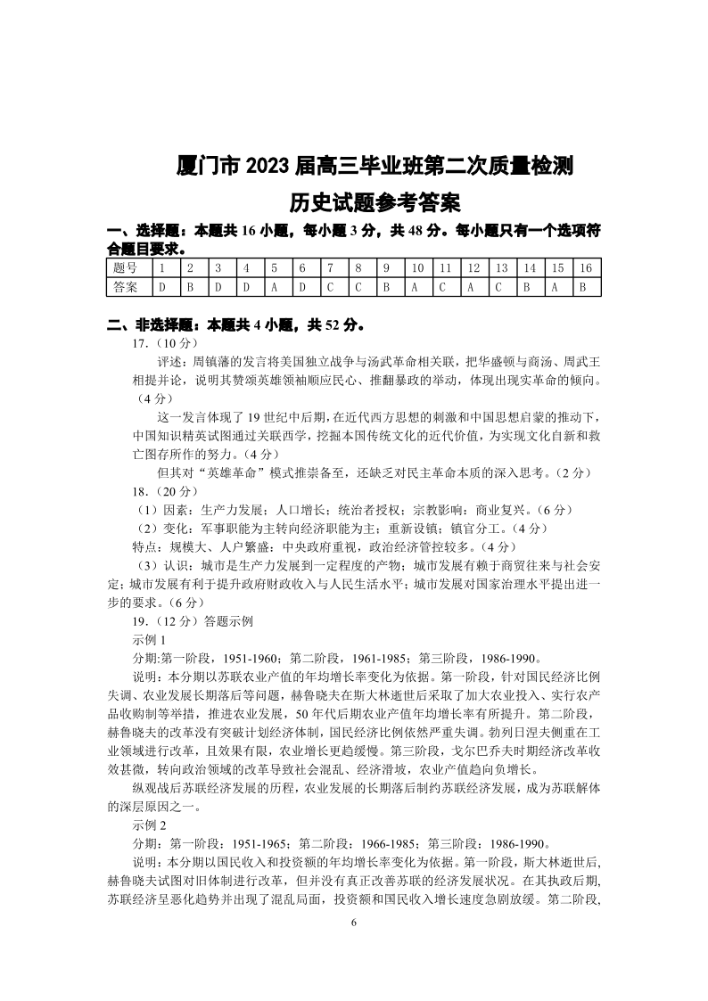 2023届福建省厦门市高三毕业班第二次质量检测丨历史答案